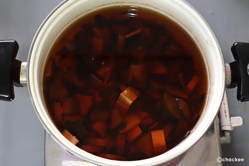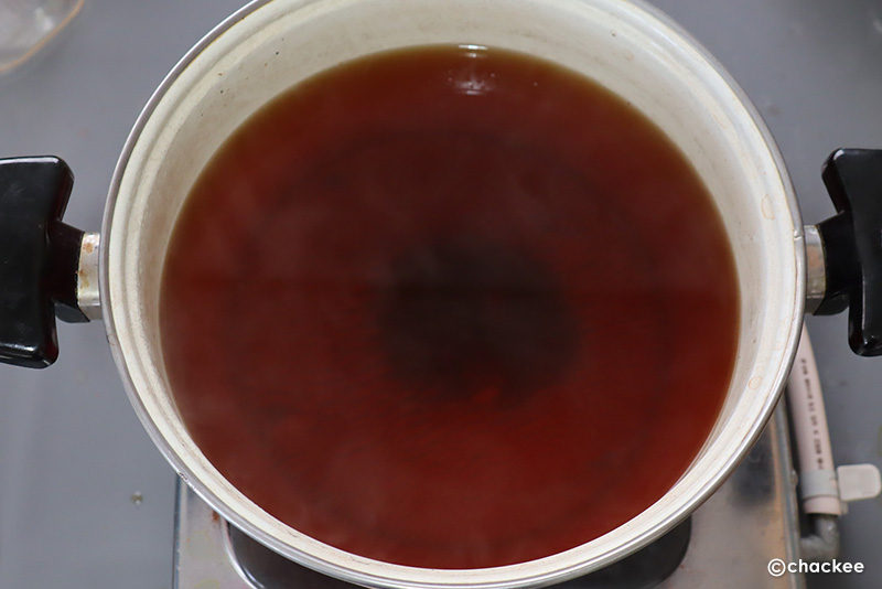 【ヤマザクラ チップ:300g】【ぬるま湯:2000cc】で、30分煮出す。そのまま数日間放置。放置した後の染液は赤味が出ている