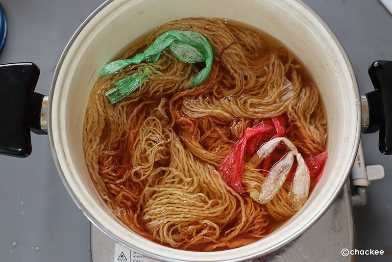 - 染材(絹糸)を入れる(事前に染材をぬるま湯で濡らしておく)
