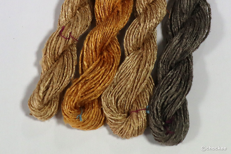 さくら色には染まらないと思っていましたが、それなりの発色を得られたと思います。《ミヨウバン先媒染》は濃いベージュ、《銅後媒染》もほぼ同じような染め色です。《鉄後媒染》はそれなりに深い黒味を持ち、《チタン先媒染》は期待以上に発色を確認できました。
