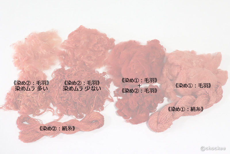 インド茜染め①で染めた毛羽の色はかなり薄かったので、インド茜染め②は同じ染料材の根を使って数日間ゆっくり染料液を抽出して(ほぼ放置)《毛羽》と《絹糸》を染めてみました
