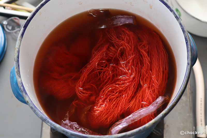 赤い色が簡単に抽出できるのでそのまま染色へと進みましたが、染材(毛羽)を完全に乾燥させたらかなり薄い色の仕上がりで「赤」というより「少し黄色みを帯びた濃いピンク」です。