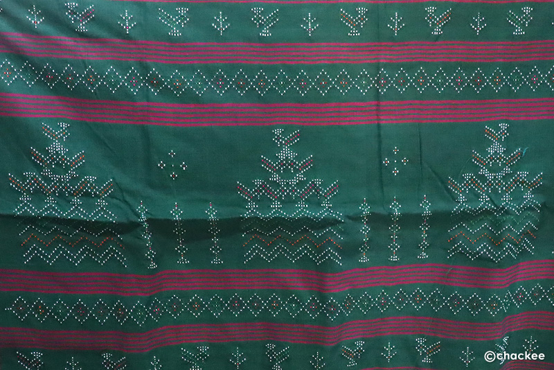 出来あがったドット柄は沖縄の花織りや刺繍のステッチ、ビーズの埋め込みにも見えます。布の表裏面を見比べても結び目や切った毛糸先は全くありません。模様の糸端は見えないのです。元々、素材はウール糸での織布でしたがここは暑いインド、現在はコットンやシルクの糸を使っているようです。ただ、カラードットとなっている部分の色糸は簡単に入手できる現代的なアクリル毛糸を使っていました。