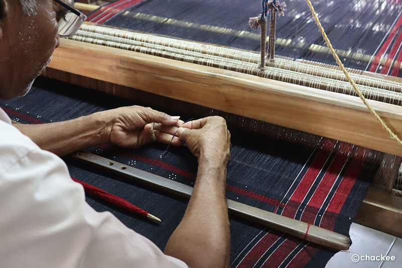 「タング(tang)」は脚、「alya」は前という意味で織布を腰に巻いた時、脚の前に模様がでるように織り柄を入れるという意味もあるそうです。約700年近く続く手仕事で、コミュニティに伝わるお話などもお聞きしましたが、今回のここでは省略します。