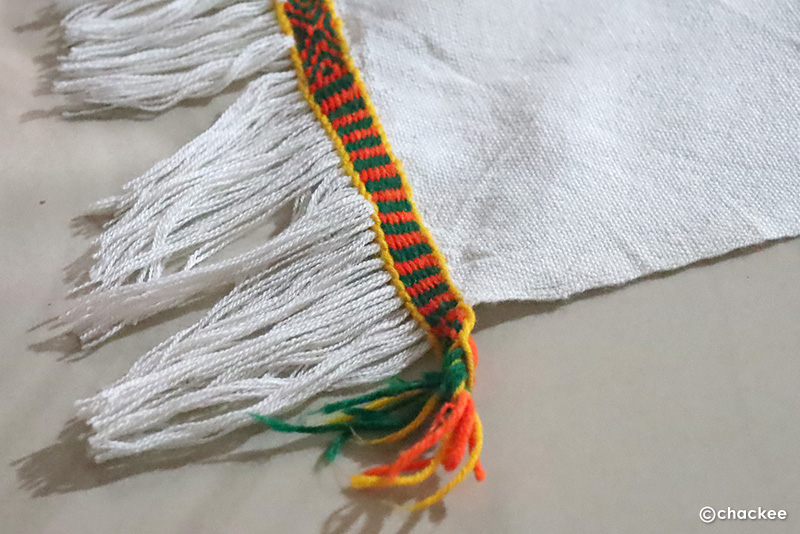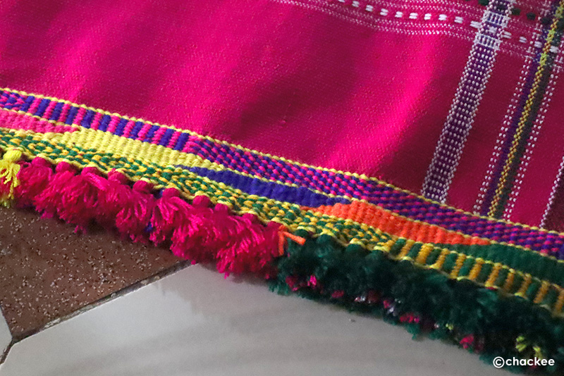 しかし、ここで見たカード織りはまったく別のものでした。「カードを回しながら織る」という様式は同じですが、目的が全く違います。紐やバンドは作りません。大きな織布を継(つ) いだり接(は) いだりするためにカード織りを使っているのです。カードに通した経糸を張る部分までは同じですが、フリンジ部分を数本ずつ差し込んだり、大きな布の経糸の端や2枚の布を接ぐために縫い留める糸を緯糸として織りあげるのです。一方から入れた場合は布端の飾りに、左右から交互に入れた場合は布継ぎになるのです。ここのショールといってもウールでできた大型化した布は防寒や雨よけ、座る敷物といろいろな目的で使うそうです。