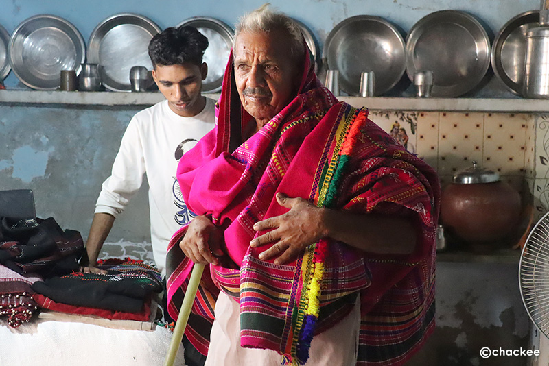 カード織りを施した大判のウール ショールを巻いてみてくれたジワさん