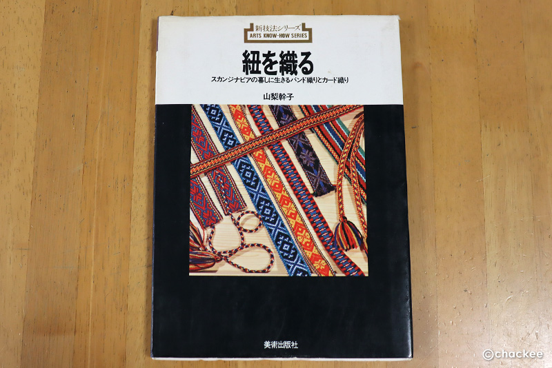本棚の奥から取り出した学生時代にカード織りを参考にした本。北欧スカンジナビア半島のバンド ウィービングとカード ウィービングの研究書 ※