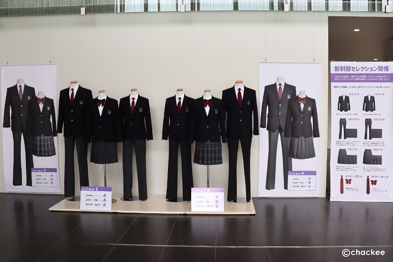 会議棟に 6体のマネキンが並んでいて、男女 2グループの制服案と 4つの組み合わせ案ができていました。しかし基本的な形はほぼ同じで色が「明るい紺」か「濃紺(ほぼ黒)」、スカートやリボン、ネクタイなどのチェック柄の違いを展示しているという感じでした。