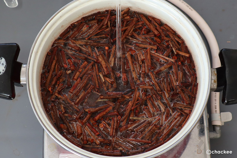 【水: 1500cc】で30分くらい沸騰させずに煮る。根を入れた状態で3日間くらい繰り返す