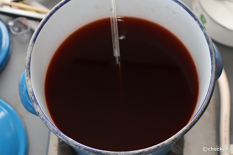 抽出①は濃く染まらなかったので抽出①で使った【インド茜の根: 100g】を利用して、もういち度【水: 1.5ℓ】に入れて沸騰させずに30分くらい煮出す。根を入れたまま放置し、それを3日間くらい繰り返す。