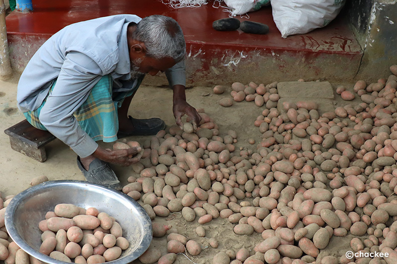 収穫したジャガイモを選別しているおじいさん。