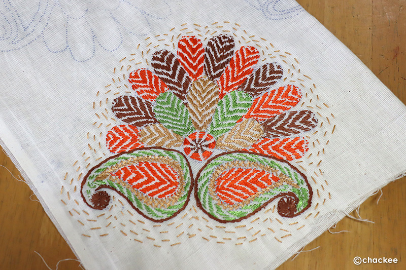 このジッコルガサ村の『ノクシカタ』の特徴は日本でいう「波縫い」である『カンタステッチ』と呼ばれる「ランニングステッチ」のみで刺繍されています。柄の全面を埋めつくす「サテンステッチ」ではなく、折り返し時に見えるステッチ巾の半分くらいをずらしていく感じでしょうか。結果として糸が出ていない地布が斜めの柄のように残って見えるのです。実際は高い技術のいらないとても単純な縫い方ですが、この『ステッチのずらし』によって高度な刺繍に見せている様な気がします。