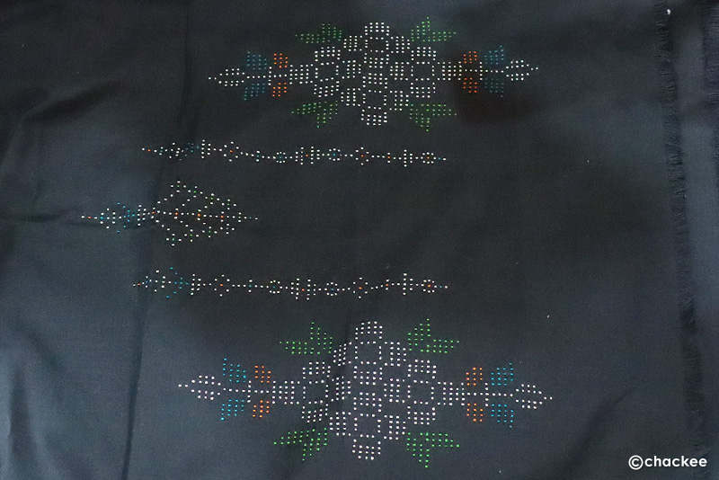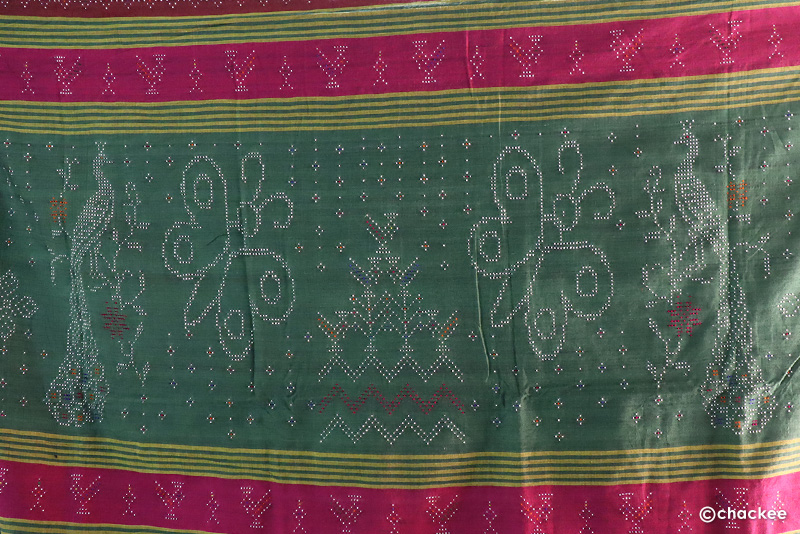 出来あがったドット柄は沖縄の花織りや刺繍のステッチ、ビーズの埋め込みにも見えます。布の表裏面を見比べても結び目や切った毛糸先は全くありません。模様の糸端は見えないのです。元々、素材はウール糸での織布でしたがここは暑いインド、現在はコットンやシルクの糸を使っているようです。ただ、カラードットとなっている部分の色糸は簡単に入手できる現代的なアクリル毛糸を使っていました。