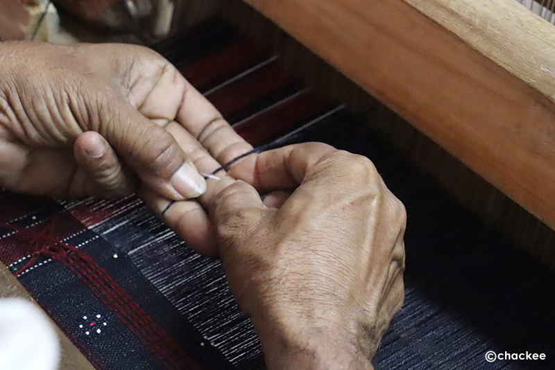 「タング(tang)」は脚、「alya」は前という意味で織布を腰に巻いた時、脚の前に模様がでるように織り柄を入れるという意味もあるそうです。約700年近く続く手仕事で、コミュニティに伝わるお話などもお聞きしましたが、今回のここでは省略します。