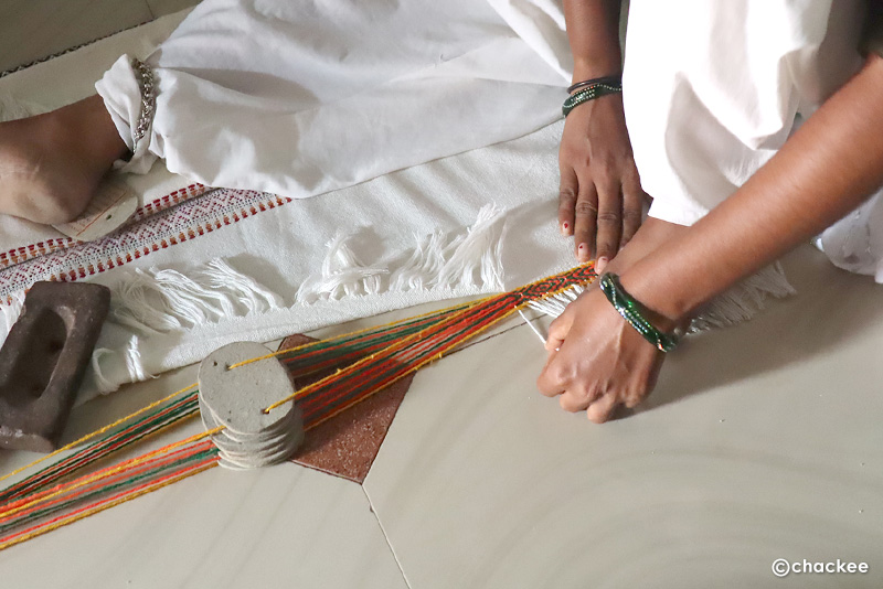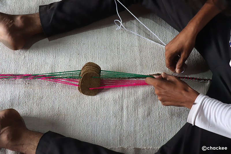 しかし、ここで見たカード織りはまったく別のものでした。「カードを回しながら織る」という様式は同じですが、目的が全く違います。紐やバンドは作りません。大きな織布を継(つ) いだり接(は) いだりするためにカード織りを使っているのです。カードに通した経糸を張る部分までは同じですが、フリンジ部分を数本ずつ差し込んだり、大きな布の経糸の端や2枚の布を接ぐために縫い留める糸を緯糸として織りあげるのです。一方から入れた場合は布端の飾りに、左右から交互に入れた場合は布継ぎになるのです。ここのショールといってもウールでできた大型化した布は防寒や雨よけ、座る敷物といろいろな目的で使うそうです。