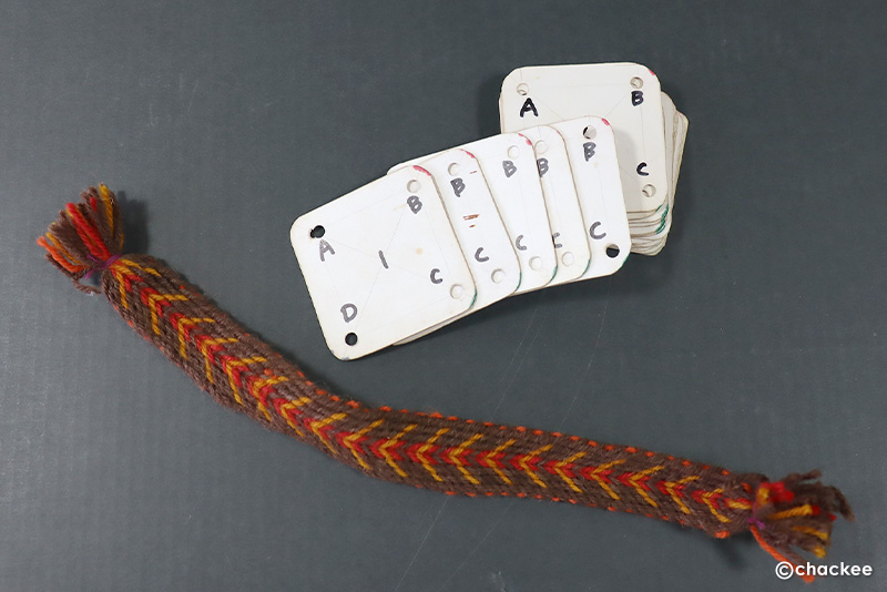 実は私、学生時代にカード織りを何度かやったことがあります。4つ穴の自作カードの約10数枚に経糸を通し、その「カードを回しながらバンドを織る」というものです。その時に見たりやってきたカード織りは「バンド・紐」作りで、基本的に『しばる・結ぶ』といった物の制作でした。