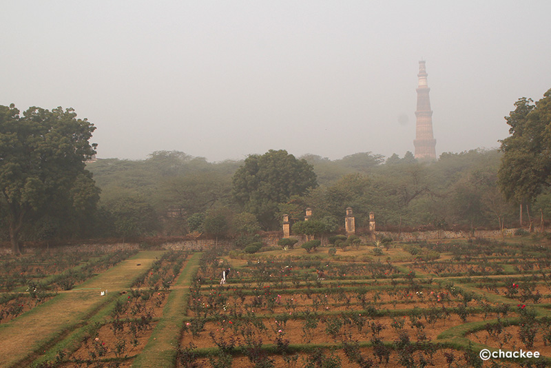 そして、公園内のバラ園の向こう側に世界遺産のクトゥブ ミナールが建っているのがわかります。