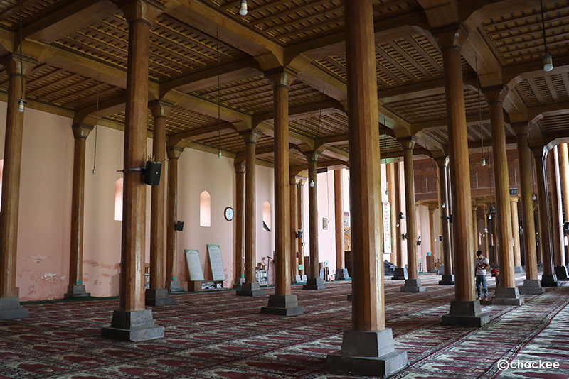 カシミールの木造モスクの中でもっとも規模が大きく魅力的な建物です。ホテルのオーナーのご厚意により内部を見学させていただきました。ここは木造のために何度か火災に遭って再建を繰り返したようで、外壁だけはレンガ造りに置き換えられています。敷地内にミナレットはありませんが、尖塔型の屋根の頂部がその役割も果たしているそうです。礼拝堂内部はシンプルな太いヒマラヤ杉の列柱が370本並んでいることから、石柱の礼拝堂が多いイスラム建築とは思えない雰囲気を創り出しています。しかしかえってそこがこの地域のモスクを象徴しているようにも思えます。