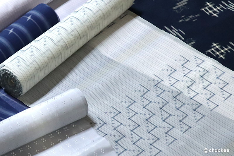 南風原の工房見学で気になったのは、「分業体制」という点です。他の織物生産場所ではほとんど最初から最後までひとりでの染織作品となっていましたが、ここでは絣の図案作成から種糸づくり、絣の括りや染色、そして機織りから湯のし、最終的な検査まで、町の多くの人が関わることで高品質な織布をキープして一般流通させているようです。