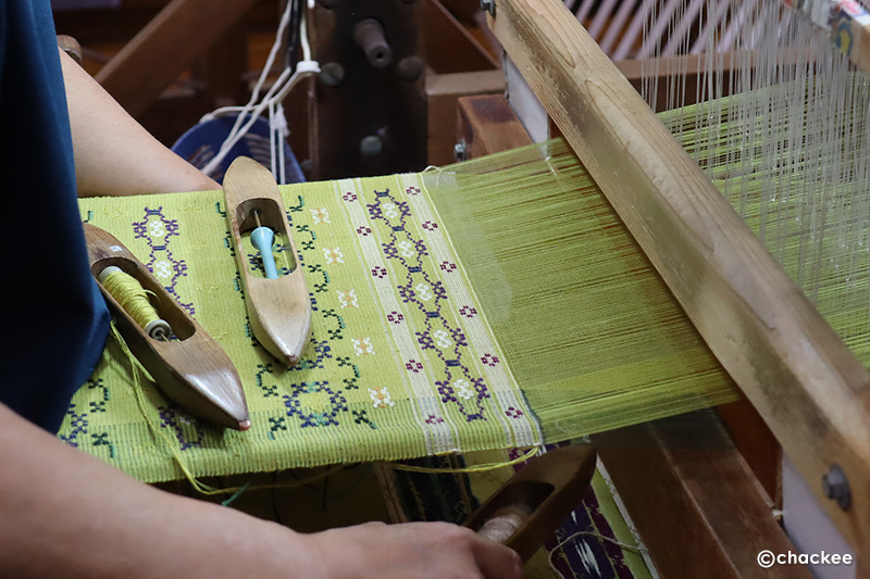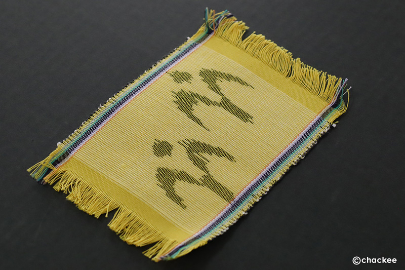 以前、絣織りを何度もやった経験がありますが、今回の体験である種難しかったのは、緯糸の左右に目印になる絣のポイントがすでに設けられていた点です。機の張り具合や左右の杼(ひ)飛ばし具合でキレイに調整できるのでしょうが、この体験ではポイントが合わず鳥の柄はケバケバ、左右の縁がガタガタになってしまいました。