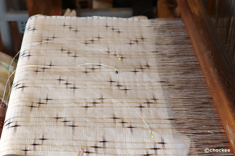 緯(よこ)糸に絣が施されている。左右の目印どおり緯糸を通したつもりがケバケバな「トゥイグァー」になってしまった