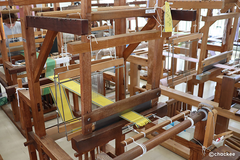紀元前3~4世紀ごろインドで作られるようになった絣は東南アジアを経て、15~16世紀に琉球に伝わり飛躍的な発展をとげますが、薩摩の侵略から厳しい管理下で貢布としてだけ織られることになりました。機織りには多くの島の女性たちが従事し、明治になると本土で商品としての琉球絣が市場に出回り産地として根付いていきました。南風原では1910年代には分業体制を整えていったようです。しかし、第二次世界大戦で激戦地となってしまったため、織物工場は閉鎖へと追い込まれましたが、戦後、生き残った人々により真っ先に復興させたのだそうです。