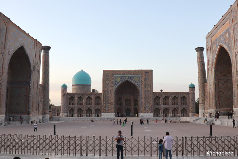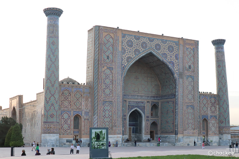 「青の都」サマルカンドの観光地、ウズベキスタンを代表する施設と紹介されているレギスタン広場。