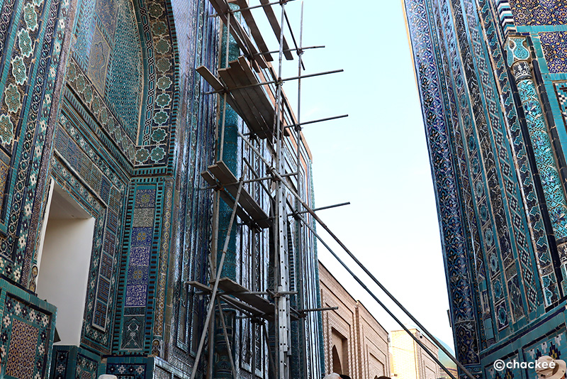 青い回廊のような廟のアーチが並ぶ。いくつかの場所で修復中の足場が設置されている