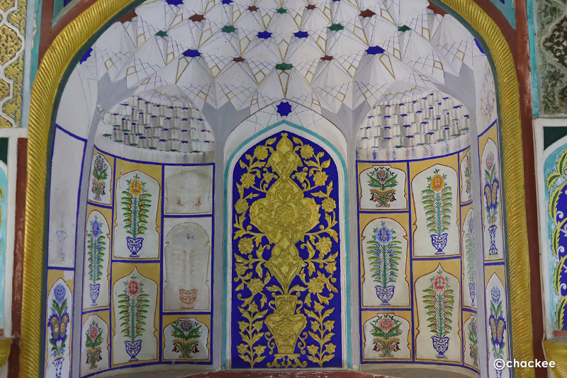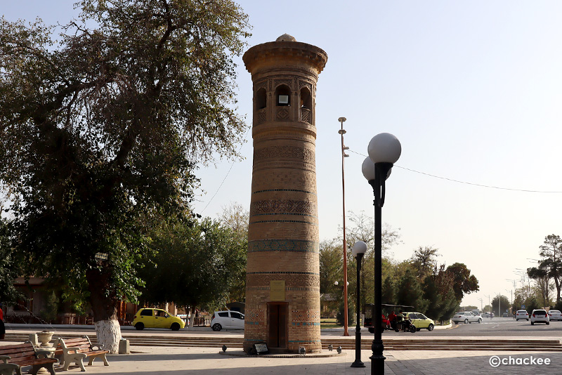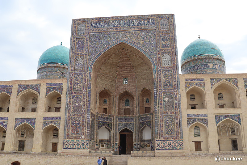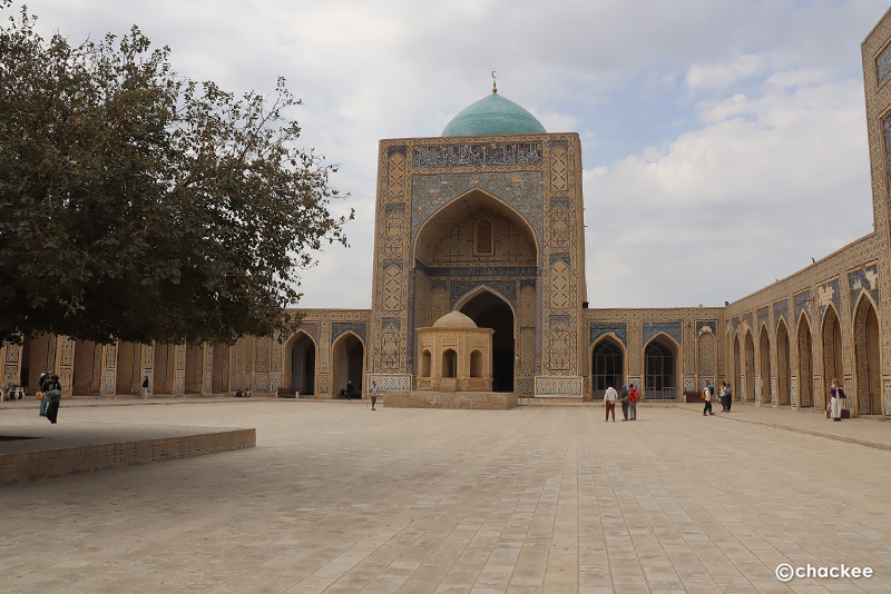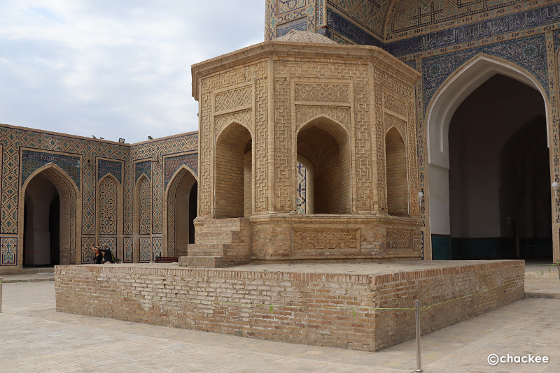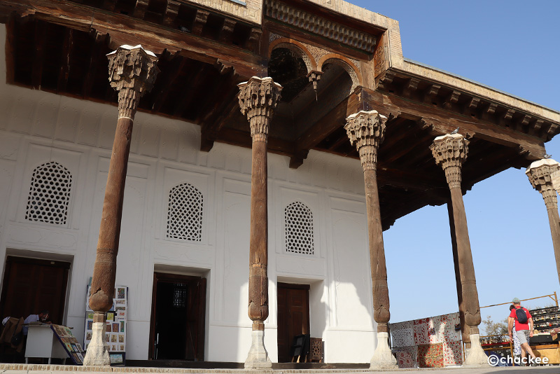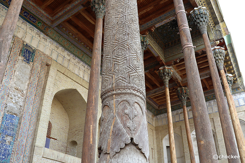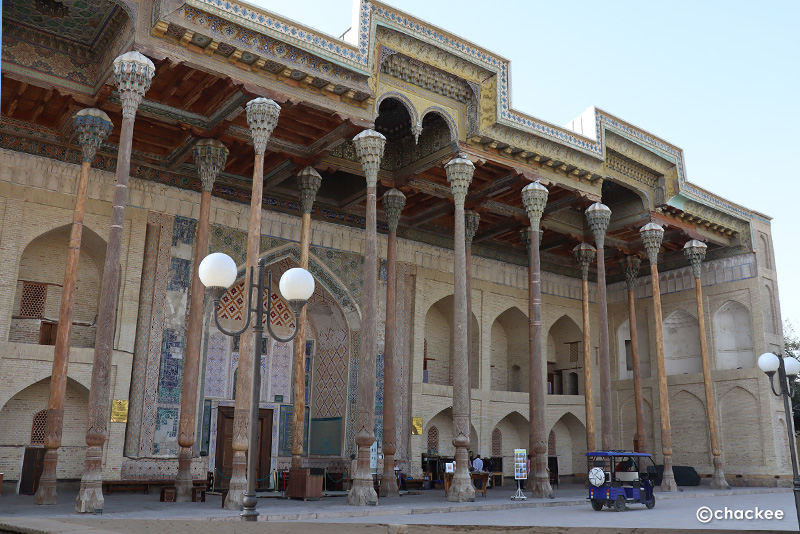 このモスクは18世紀以降、歴代のブハラの首長がソ連征服下時代にも金曜モスクとして使われていました。私たちは中に入ることは許されないので、正面の20本の彫刻が施された柱とイワーン (iwan)と言われるファサードから突き出た門の見学です。柱の付け根部分やファサードの中心は色とりどりのムカルナスで飾られています。横には1917年に建てられた小さなミナレットも見ることができます。