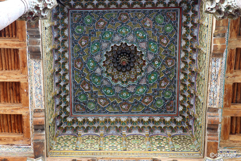 大きな城門をくぐり少し急勾配で大きな石畳のスロープ(動物に乗って入城したと思われる感じ)を進んで行くとモスクとして使われていた木造建築の建物が目の前に現れました。この建物はモスクと言ってもムカルナスで装飾された天井や壁面の色合いやデザインがなぜか東洋(中国)を感じます(私的感想)。そして城内のいくつか部屋は博物館となっていて陶器や王の衣装、民族衣装などが展示されています。