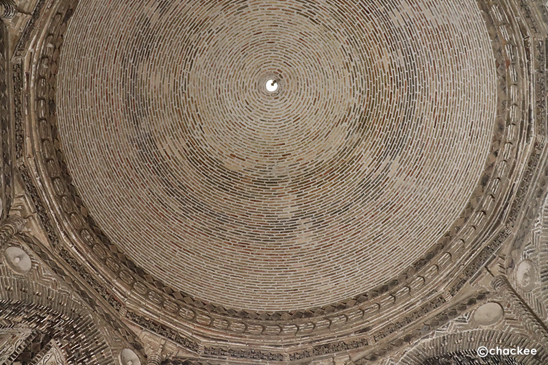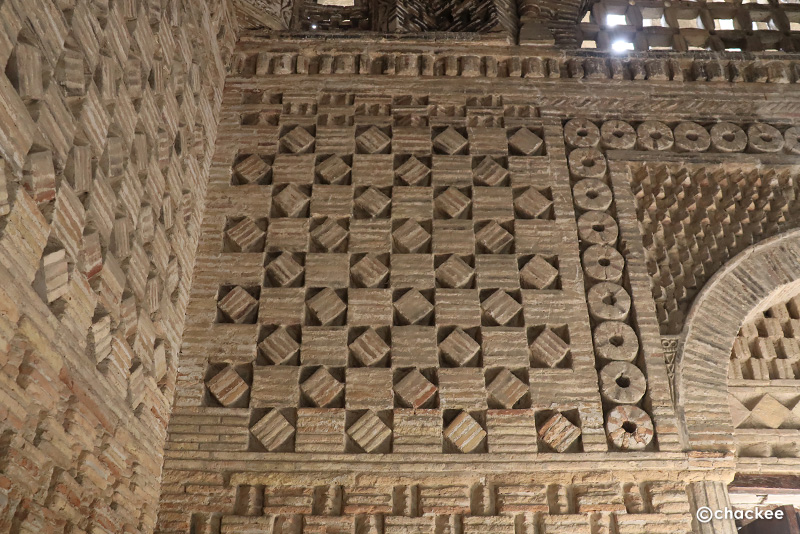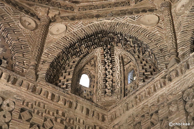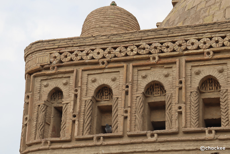 私の思う『レンガ積み』とは漆喰などによりフラットな面で構成されている建造物ですが、この廟はいくつかのシンプルな形の焼成レンガの凸凹の陰影で、さまざまな模様を浮き出し壁面を作っています。色合いもシンプルですが当時の建築技術とデザイン性の高さを感じることができる廟でした。