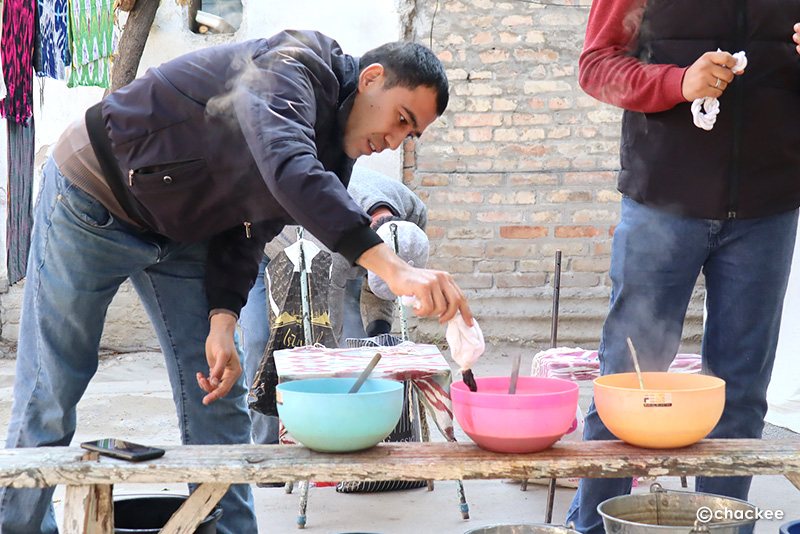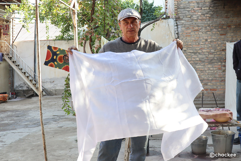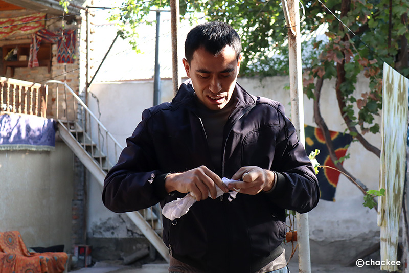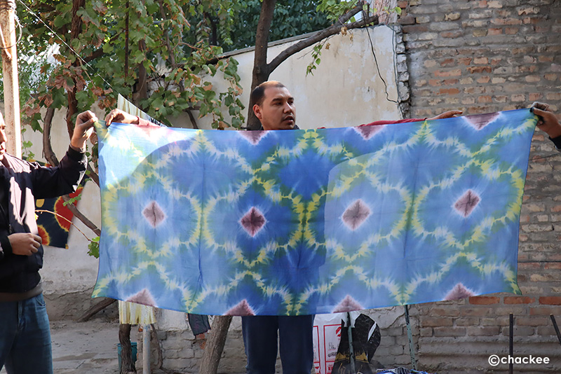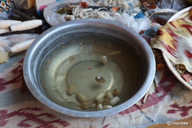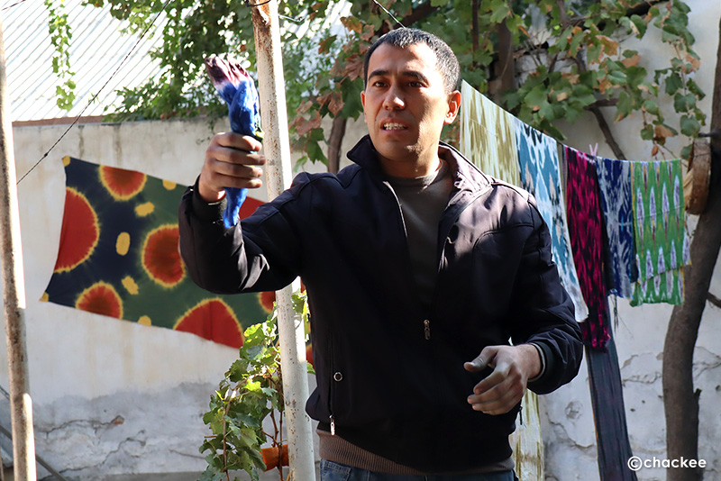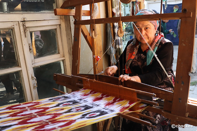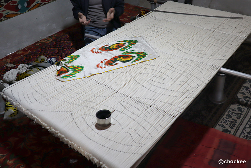 マルギランの染織地域ではデザインや糸紡ぎ、染色などの工程は男性の専門職人が分業で担当しているのだそうです。ここの工房はほとんど男性スタッフだったので、普段は織る工程をやっていない感じでした。