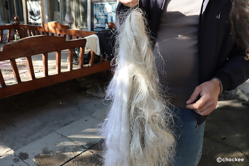 マユから糸を取る糸繰り(マユがかなり小さいので糸も細い)座繰りの様な紡ぎ方法を見たかった
