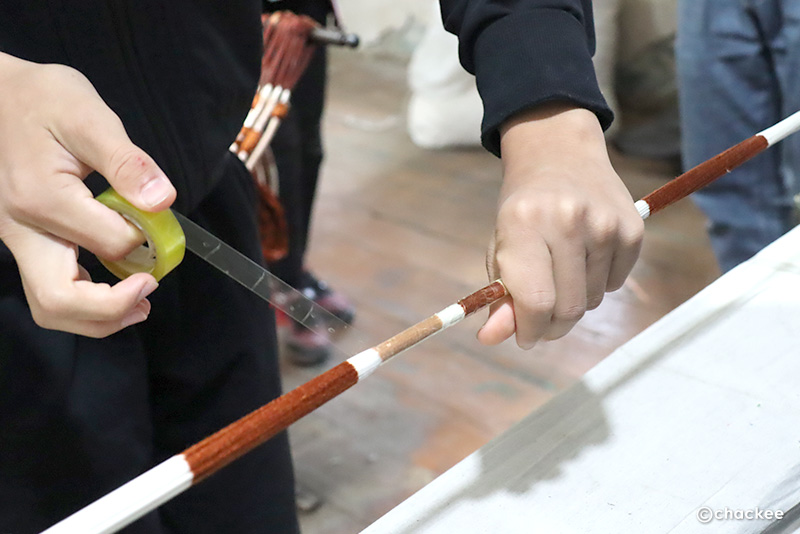 白い布を手元でクシャクシャと紐でしばる(絞る)