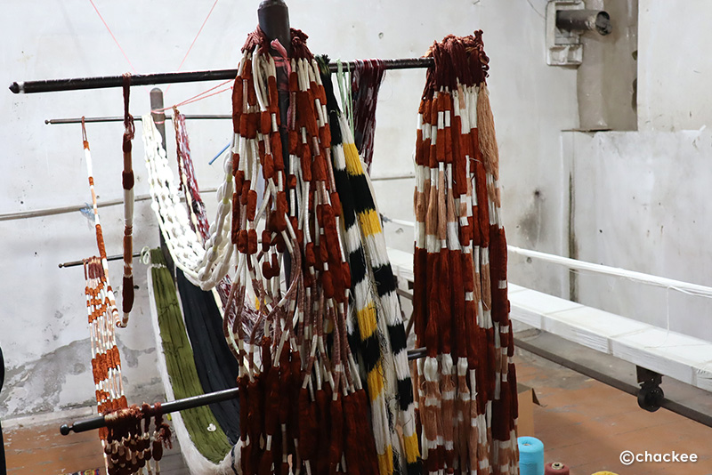 「織り」は女性の仕事の様で訪ねた工房では本格的な織り作業をしている人はいませんでした。途中でやってきてセッティングされた機(はた)の前に座って織り姿を見せてくれました。かかっていた経糸は綿糸のブズ。