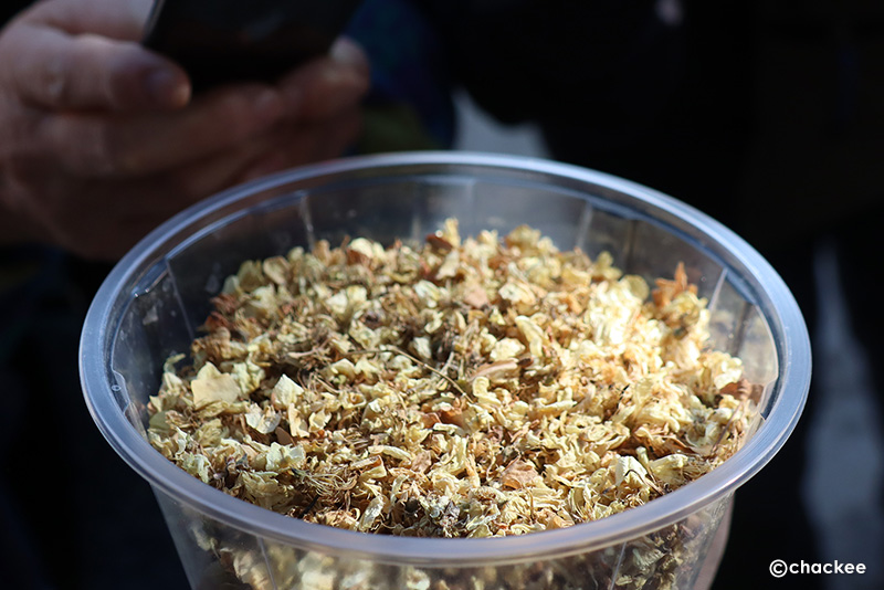 パフォーマンスは黄色も粉末を使っていたが、草木染めとしてAkatsiya Daraxtiという花房をつかうらしい。アカシアという発音だが、日本のアカシアとは少し種類が違う感じがする